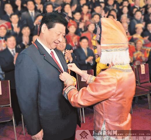 ????“我代表廣西各族人民為您獻上吉祥如意的繡球。”身著壯族服裝的女代表李敏為習(xí)近平掛上一個精美的繡球,感謝黨中央、國務(wù)院對廣西的關(guān)心和支持。