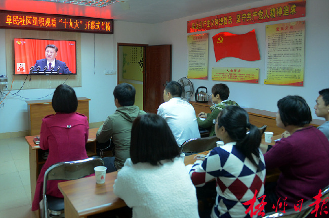 ??? 10月18日,在阜民社區(qū),社區(qū)干部和群眾正收看黨的十九大開幕大會(huì)直播。當(dāng)天上午,我市各社區(qū)集中收看黨的十九大開幕大會(huì)直播,社區(qū)黨員干部們表示,要以百倍的信心和熱情投入社區(qū)工作中,踐行全心全意為人民服務(wù)的宗旨。 李鴻榮 黎海平 攝