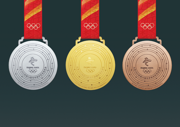 北京冬奧會獎牌“同心”由圓環加圓心構成牌體,形象來源于中國古代同心圓玉璧,共設五環,寓意五環同心,同心歸圓,表達了“天地合、人心同”的中華文化內涵,也象征著奧林匹克精神將人們凝聚在一起,冬奧榮光、全球共享。獎牌設計與北京2008年奧運會獎牌“金鑲玉”相呼應,展現“雙奧之城”的文化傳承。獎牌正面中心刻有奧林匹克五環標志,圓環淺刻裝飾紋樣,均來自中國傳統紋樣,其中冰雪紋體現冬奧會的特征,祥云紋表達吉祥的寓意。