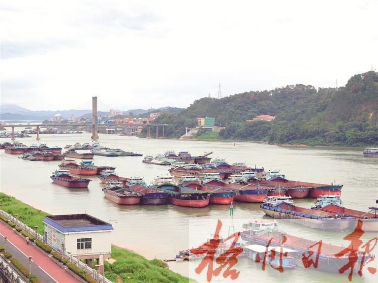 9月24日,在梧州西江鴛江麗港附近水域,貨船就近停泊。記者 李鴻榮 攝