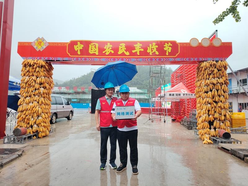 網絡技術人員在蒙山縣“中國農民豐收節”暨夏宜瑤族鄉經濟社會高質量發展活動中測試網絡。