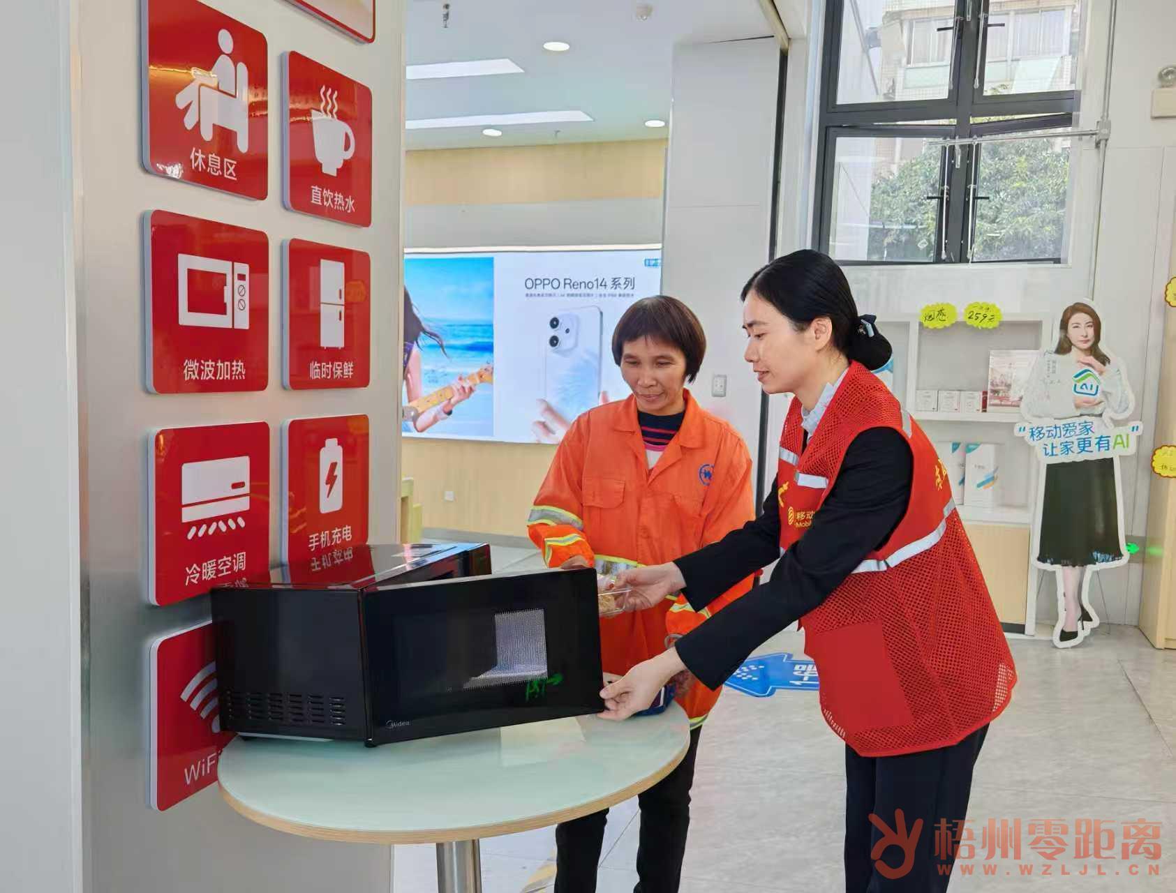 10月24日上午,一名環(huán)衛(wèi)工人提著還沒吃完的早餐走進(jìn)中國移動新興三路營業(yè)廳。原來,忙碌了一早的她發(fā)現(xiàn)早餐變涼了,想起營業(yè)廳工會驛站常為戶外勞動者提供便利,便抱著試一試的心態(tài)前來求助。營業(yè)廳工作人員李妍立刻熱情上前接過環(huán)衛(wèi)工人手上的早餐,熟練地放進(jìn)微波爐。短短2分鐘后,李妍帶著熱氣的早餐從微波爐取出,笑著遞到她手中:“阿姨,小心燙,您慢慢吃。”環(huán)衛(wèi)工人臉上露出了樸實(shí)的笑容,連連向李妍道謝。