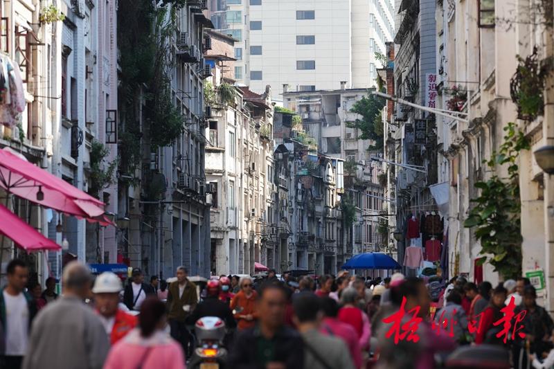 11月6日,陽(yáng)光灑在大東下路的騎樓墻面上,氣息古樸的老建筑群中,街道熙熙攘攘的人群、此起彼伏的叫賣(mài)聲,交織成一幅富有生活氣息的畫(huà)卷,展示百年騎樓的現(xiàn)代芳華。記者 楊揚(yáng) 攝
